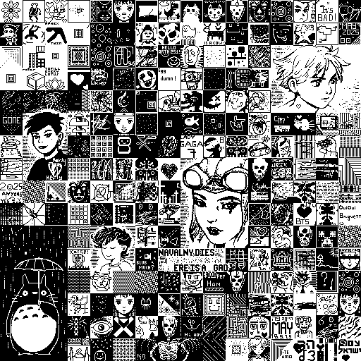 thing you'll encounter is a page with an image like this: It should be noted that glyph imagery is nothing new. Mayans and Egyptians used glyphs, and the word 'glyph' comes from (ancient?) Greek ('carving'). More recently, there is the work of Kenneth Knowlton, who in the 1960's used computers at Bell Labs to create images composed of glyphs. I first encountered one of Knowlton's pictures -- which seemed to combine Chuck Close and the teletype -- at the School of Visual Arts in the early 1990s. The present project does, however, shift the focus of authorship. It is an image-making system that can be altered from all over the Internet. It's not clear who owns the collaborative image. For my part, I encourage you to use it any way you see fit. I look forward to seeing what images develop. Finally, if you don't like the options given to you, please revise the source code. Copy it. Steal it. Share it. Print it. Pretend it's yours. I don't care.